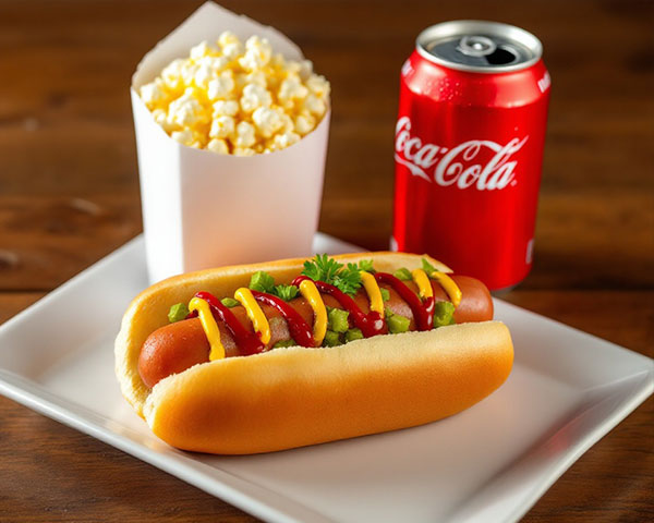 For anyone! A juicy hotdog served on a soft brioche roll with a side of buttery popcorn
